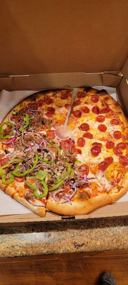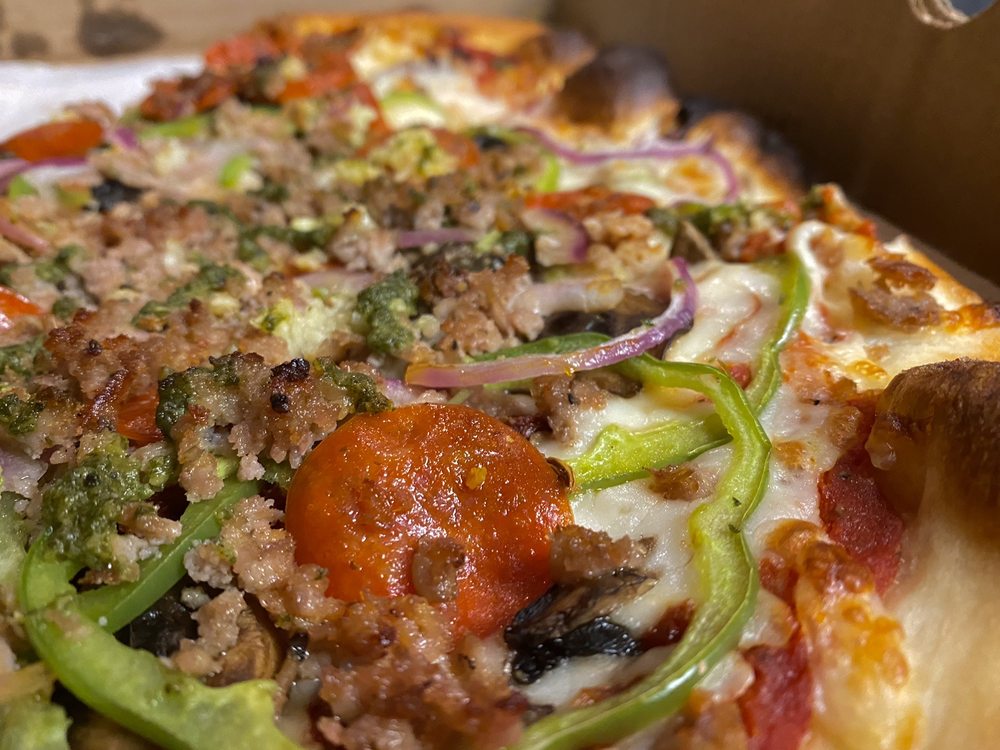 red sauce, mozzarella, pepperoni, mushroom, onion, green bell peppers, sausage