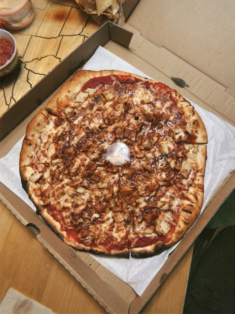 red sauce, mozzarella, pineapple, onion, jalapeno, chicken, bbq sauce drizzle