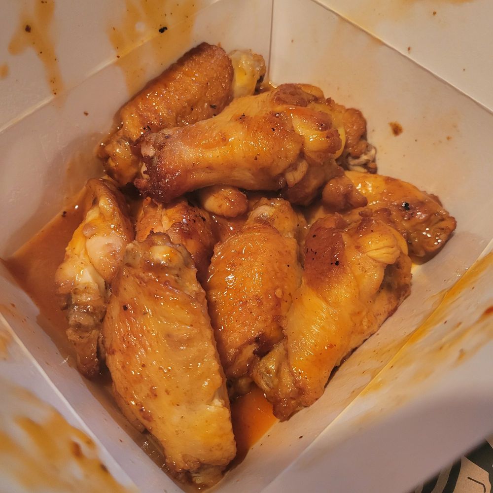 bleu cheese sauce, chicken, buffalo sauce drizzle