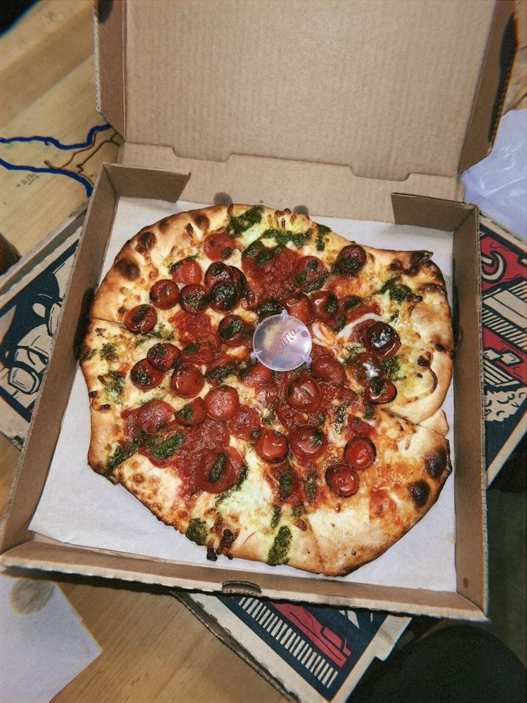 Garlic oil base, mozzarella, pasta sauce dollops, pepperoni, honey drizzle, pesto drizzle