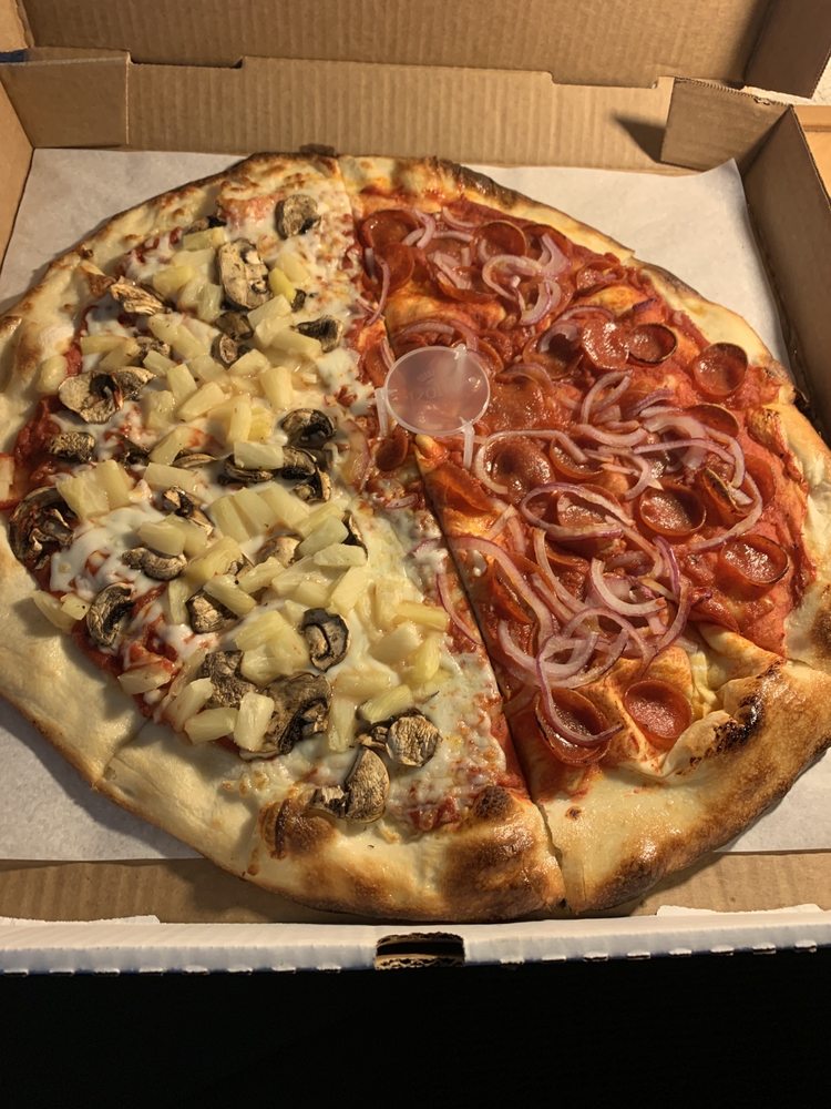 red sauce, mozzarella, pepperoni, pineapple, jalapeno